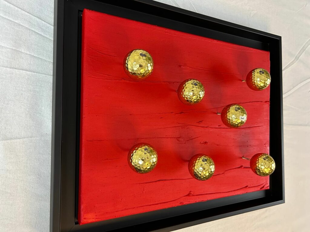 This contemporary artwork by Seb Machten explores impact through precision and repetition, using metallic golf balls as symbols of performance and mastery.